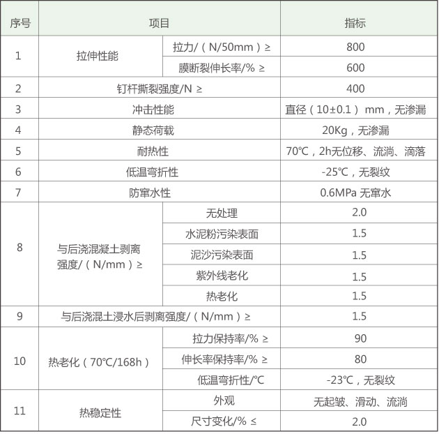 在實際施工現場環境因素影響下,卷材能與砼結構進行有效粘結,形成復合+融合的防水體系,充分恢復和發揮砼結構自防水的功能,降低滲漏概率。防水效果有保障,單層使用即可滿足一級防水設防標準要求。