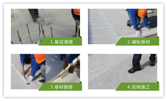 揭除卷材搭接邊隔離膜后搭接碾壓,必要時可適當加熱后搭接。