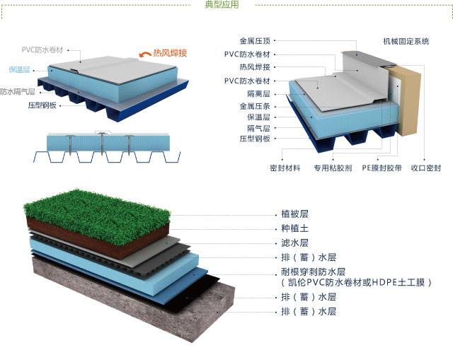 輕鋼屋面(適用于鋼結構或網架結構的屋面保溫防水) 該屋面的屋頂為網架或框架結構,屋面其基層結構為壓型鋼板,施工過程是在壓型鋼板上先鋪上PE膜,然后再鋪上保溫扳,再由專用固定件固定牢固,根據需要可鋪設隔離層,再鋪上PVC防水卷材用專用固定件來固定牢固,搭接部分用自動熱風焊機來焊接。其中在固定保溫板和PVC卷材時要適當的對重要部位加密,以增加抗風載荷能力。